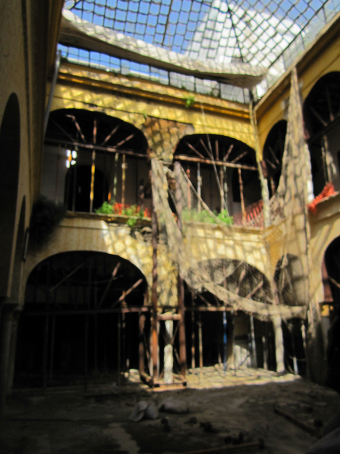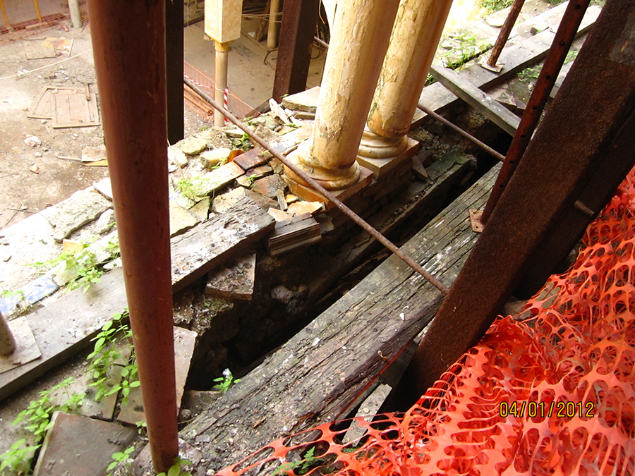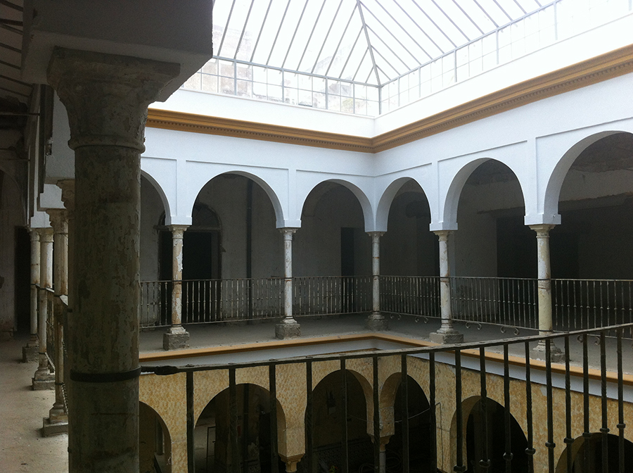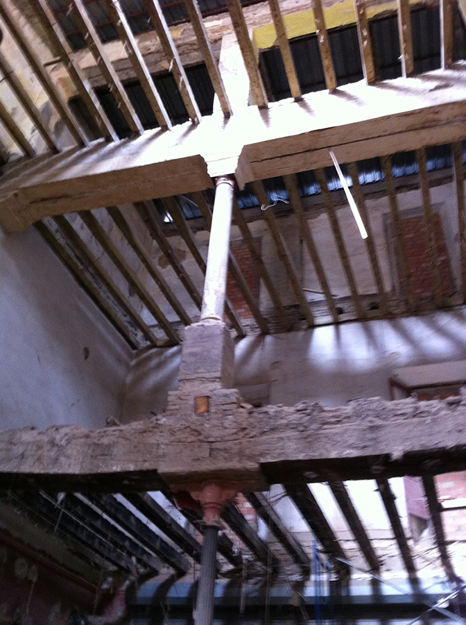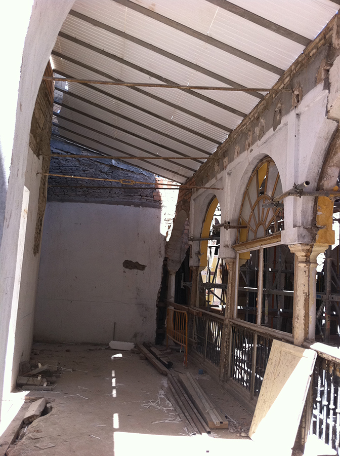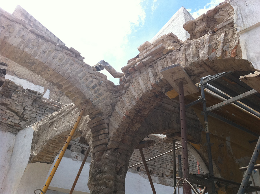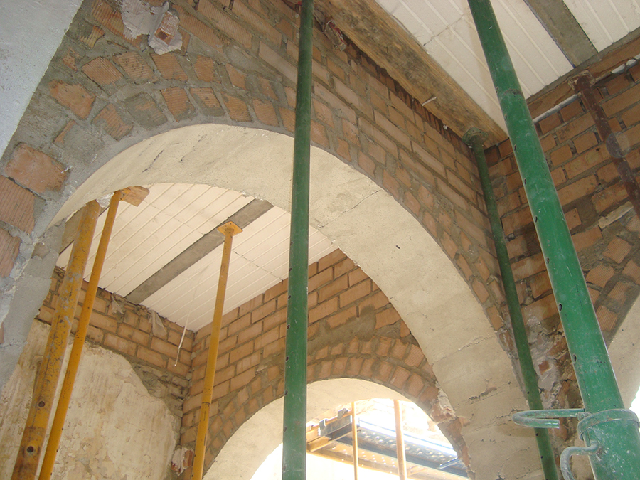 Consolidación estructural de edificio histórico protegido (casa patio s. XVIII)), ubicada en el centro de Sevilla, mediante refuerzo de muros, aplomado de columnas, recuperación de arcos, sustitución de forjados de madera.