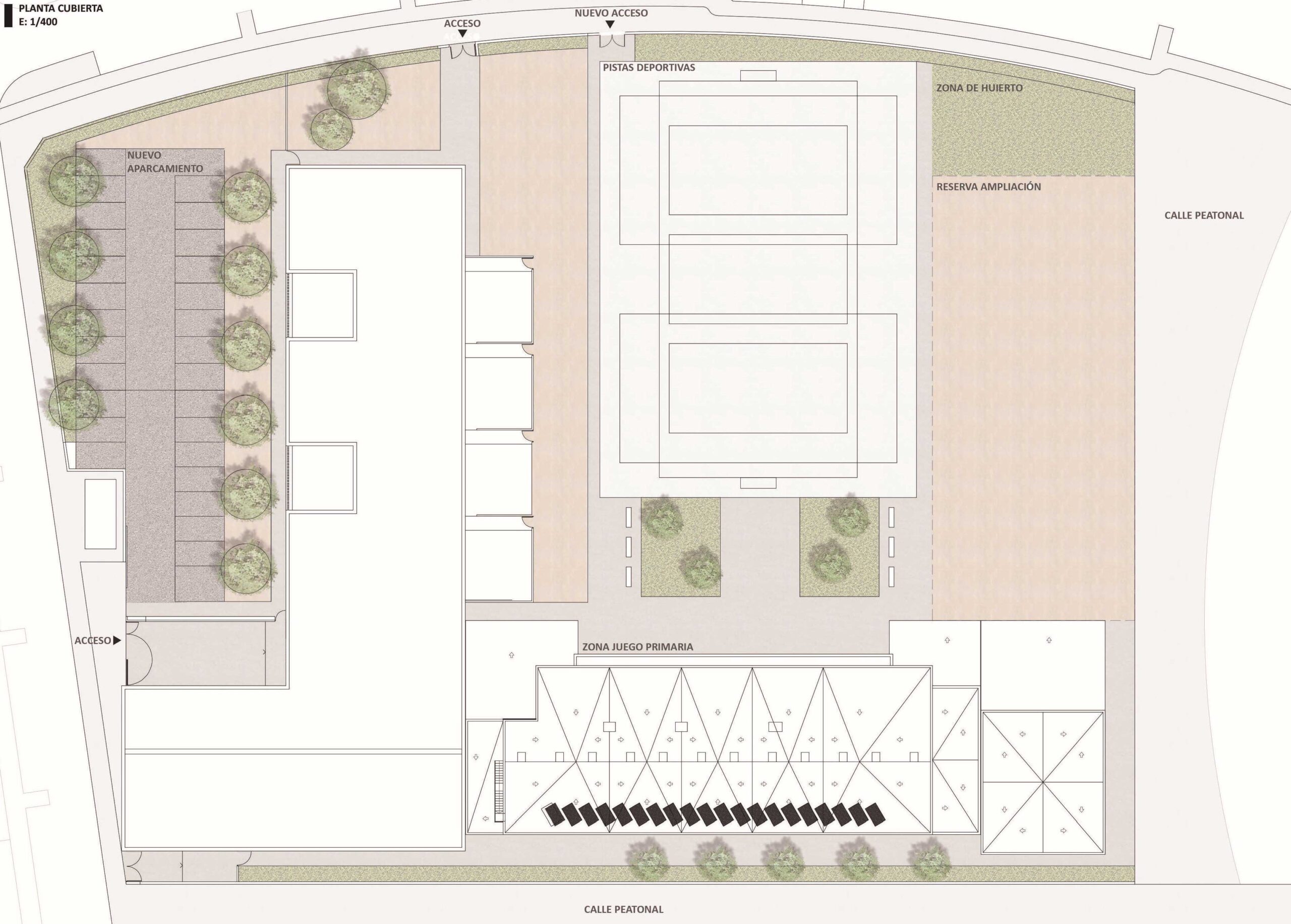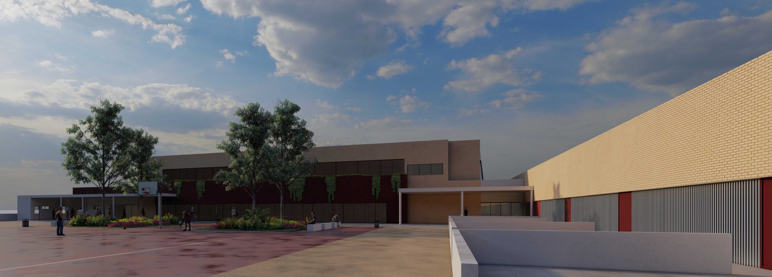 Por otro lado, se construirá la nueva cafetería, en el espacio existente entre gimnasio y el centro, consiguiendo así acceso a ella desde la planta primera, que es la principal, y un acceso rápido y fácil para la carga y descarga desde el aparcamiento.