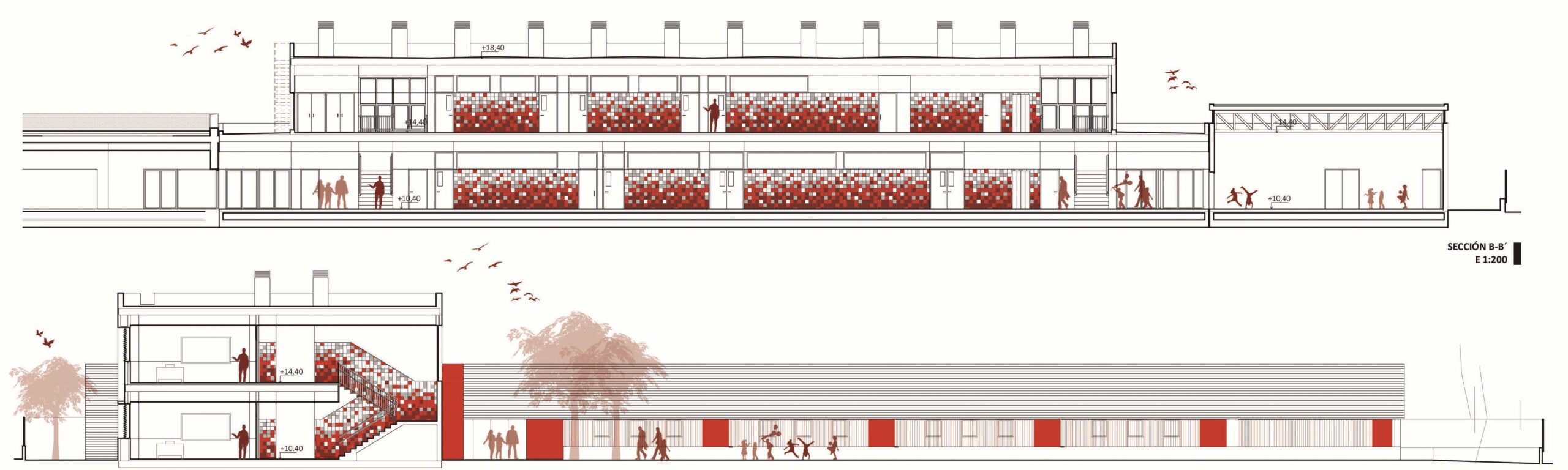 El nuevo edificio se conectará al edificio existente por su extremo sur mediante la creación de un nuevo núcleo de comunicaciones, configurándose como nuevo núcleo principal. En el otro extremo del nuevo volumen se ejecutará otro nuevo núcleo para la conexión más directa con el patio.