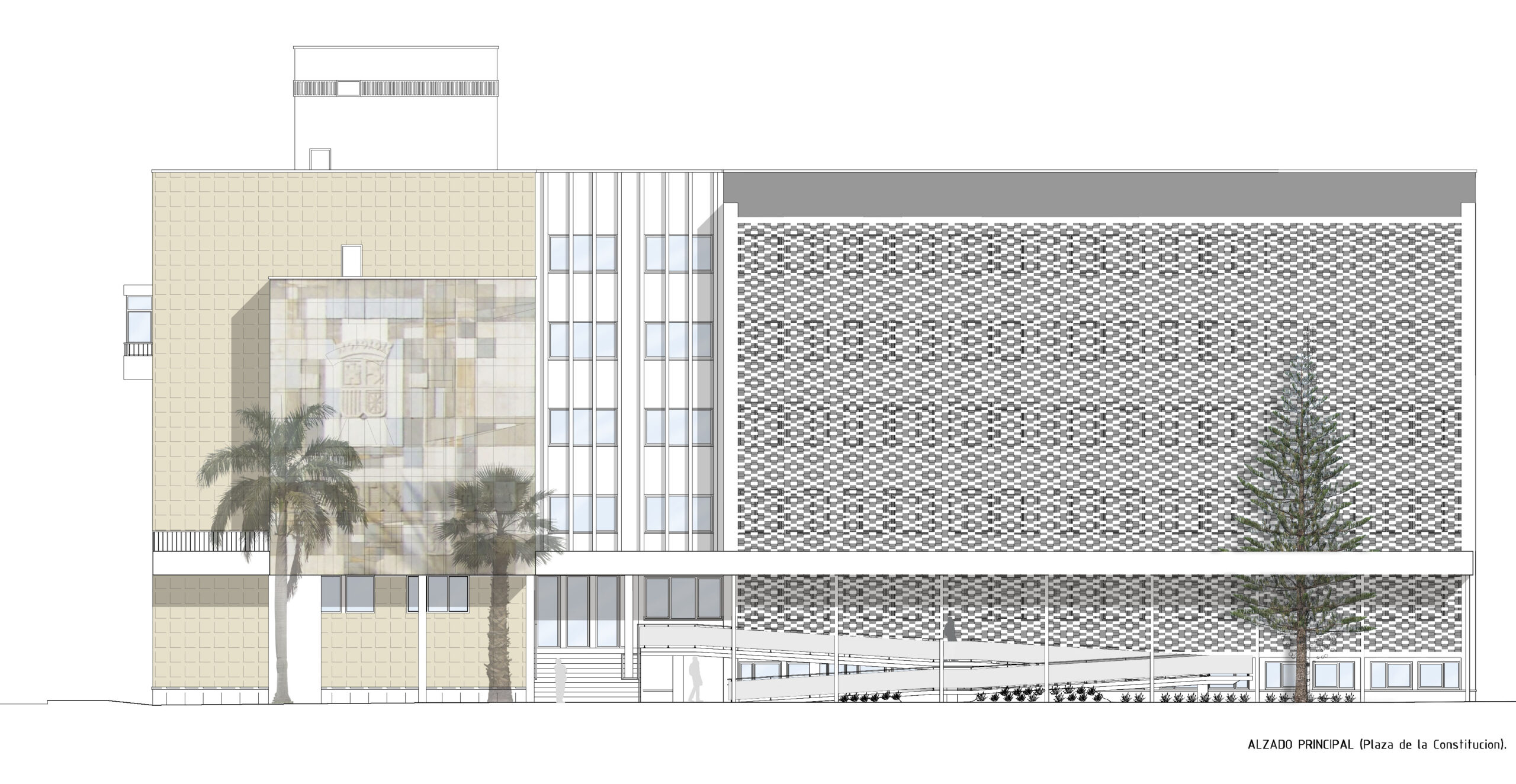 Se propone una actuación global de reestructuración de envolventes y volúmenes, destacando la recuperación de la celosía-parasol de la fachada principal y la galería exterior de acceso.