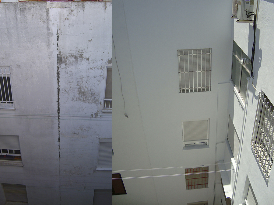 Edificio residencial de 5 plantas, afectado por humedades generalizadas, por cubierta, fachada exterior y fachada de patio, fugas en saneamiento y fontanería.