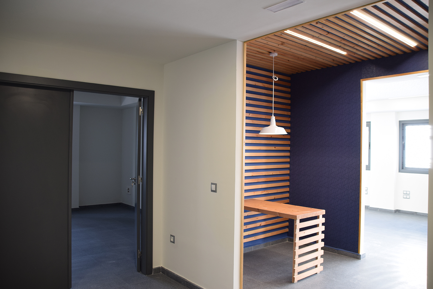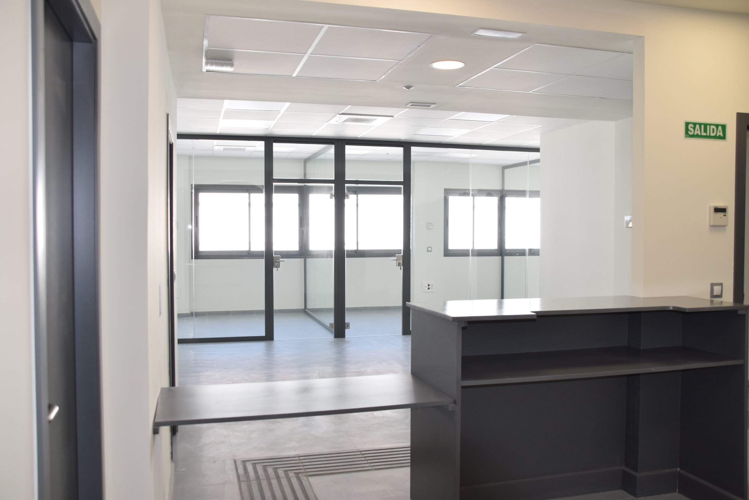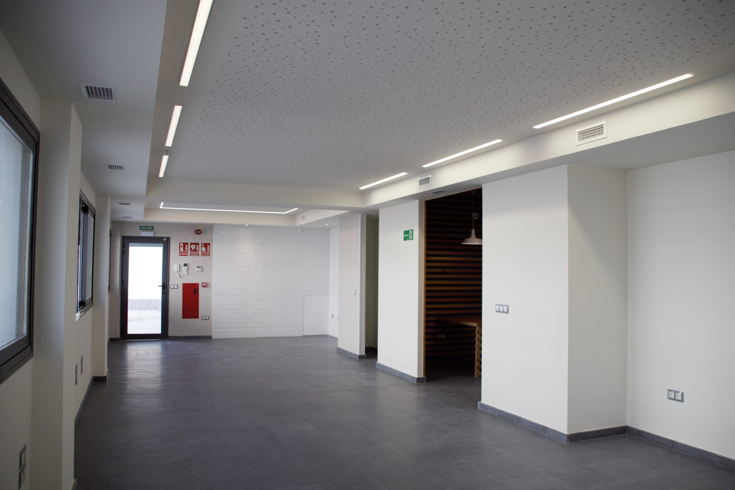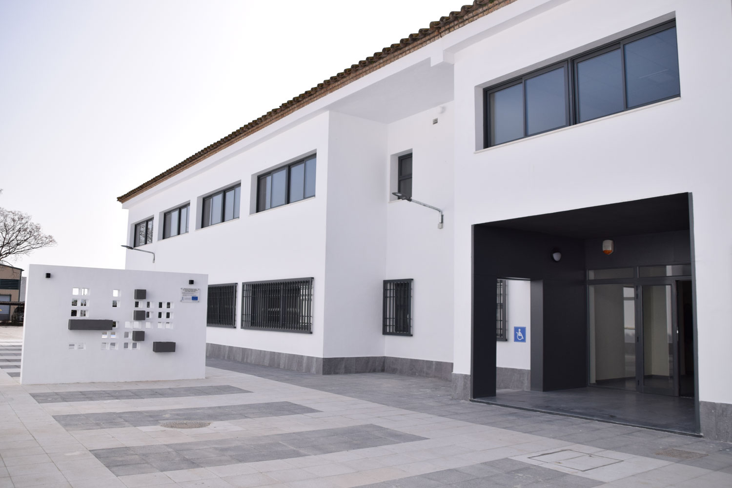Se busca un diseño neutro que no condicione el amueblado pero que dote al edificio de nueva imagen, en este sentido se ha diseñado un mural escultórico exterior junto a la entrada que servirá para colocar el cartel informativo de empresas y de filtro para los patios traseros utilizados para aparcamiento y talleres exteriores.