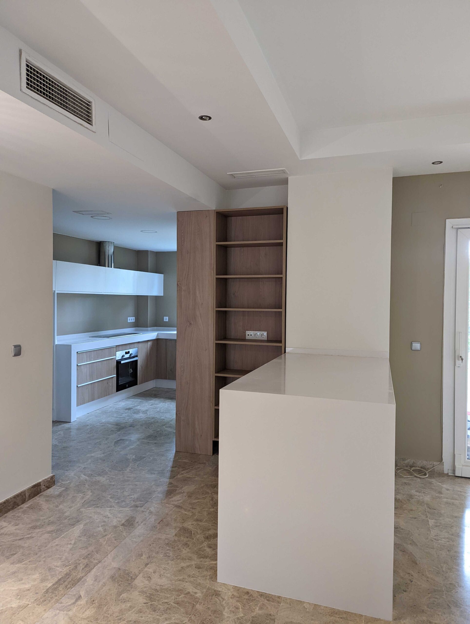 En planta baja la mayor intervención ha sido integrar la cocina en el salón incorporando parte del pasillo de entrada, de esta manera se ha incrementado la superficie vividera del salón. Una estantería acompañada de una encimera blanca que hace de barra sirve de nexo de unión entre la cocina y el salón.