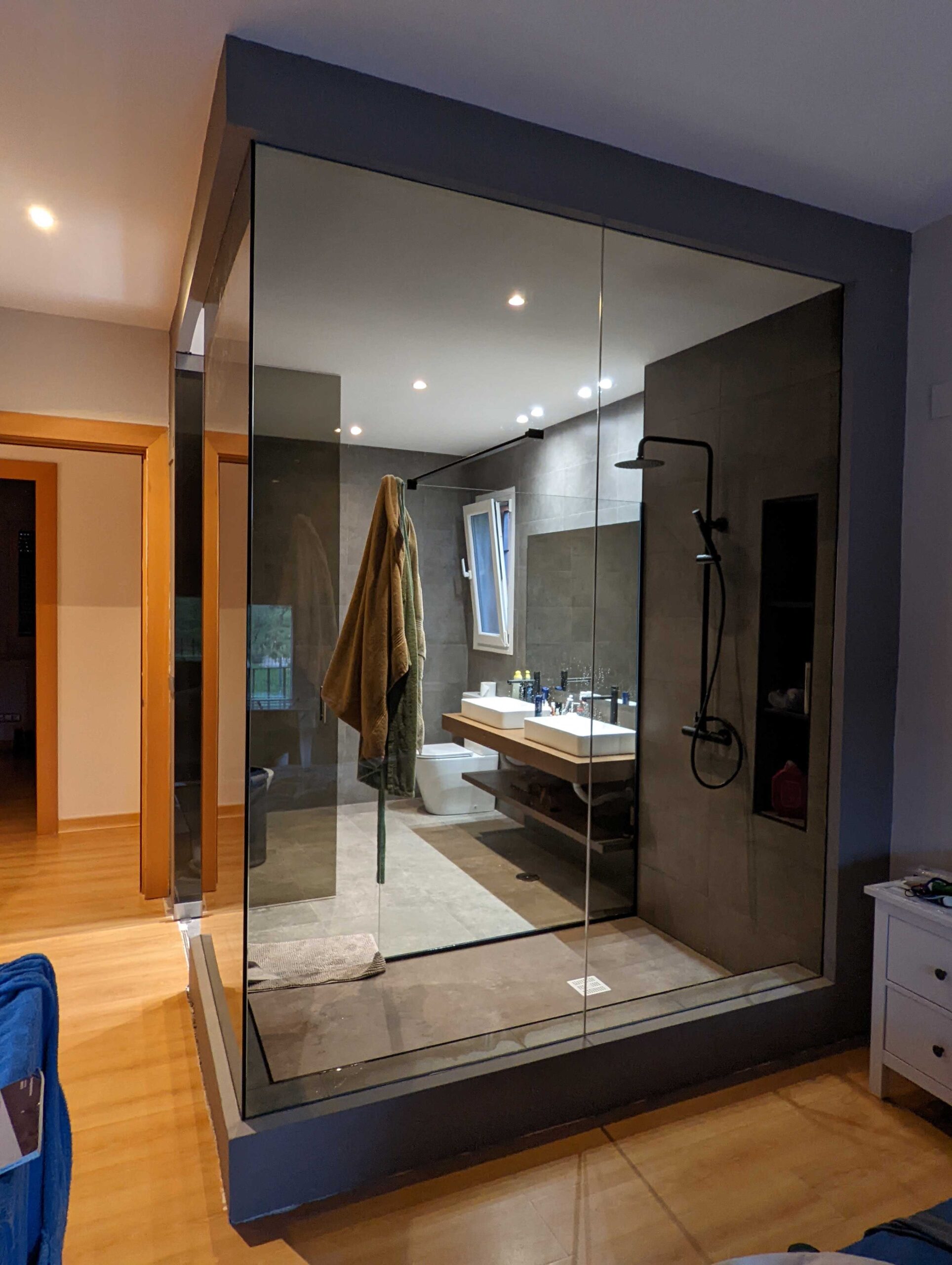 En el dormitorio principal, las paredes se han sustituido por mamparas acristaladas integrando en único volumen dormitorio y baño. Y se ha integrado un control de lunminosidad pgr para generar diferentes ambientes.