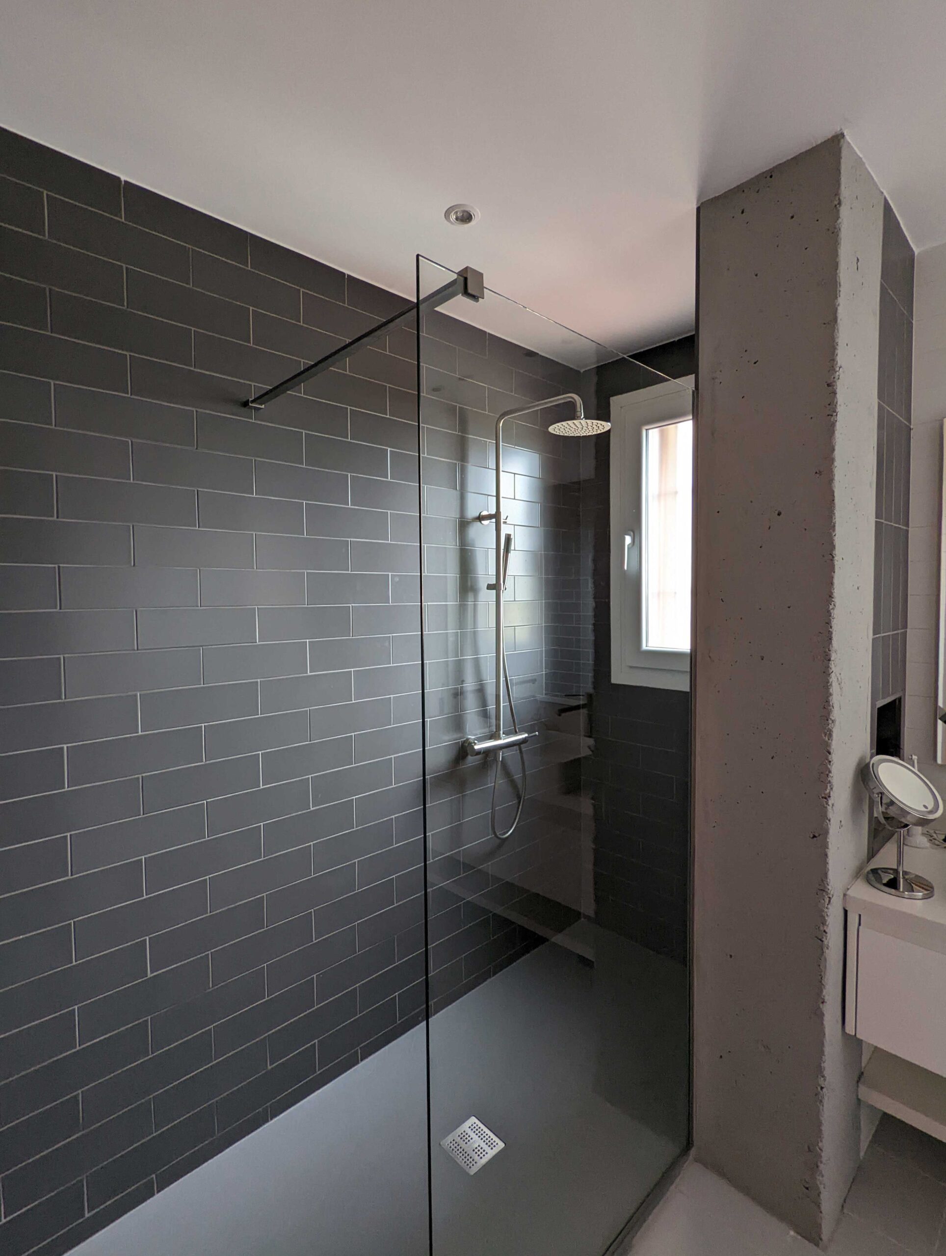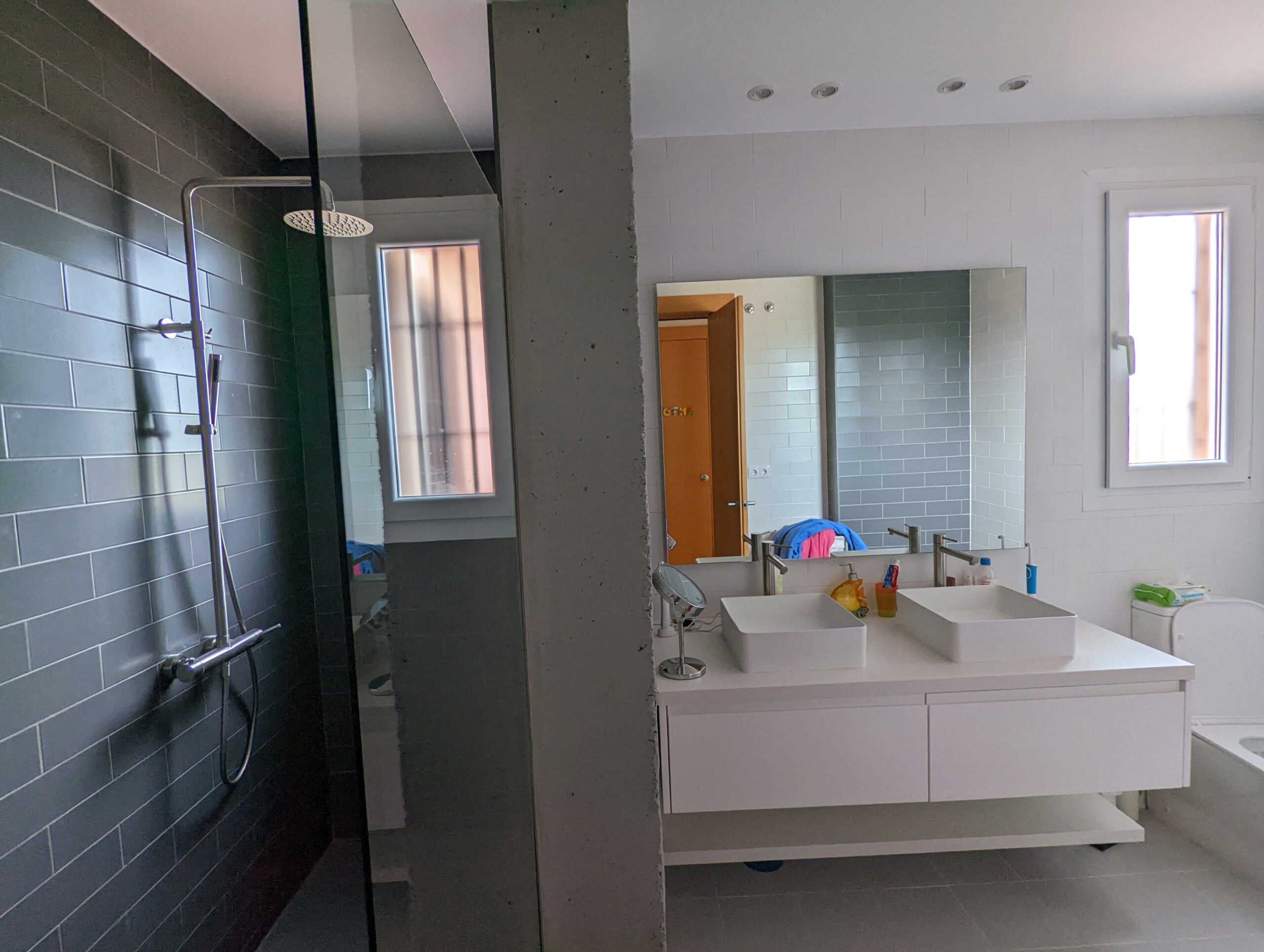 El cuarto de baño principal, se resuelve mediante alicatados en blanco y gris marengo, la ducha se separa del baño mediante una mampara de cristal, lo que da profundidad al baño. En el tabique separador entre los lavabos y la ducha se integran hornacinas para el acomodo de los elementos de aseo personal sin la necesidad de incorporar mayor número de mobiliario.
